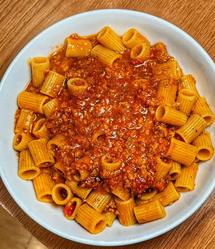 Rich, creamy, slow-cooked spicy sausage ragu tossed through rigatoni (arguably the best pasta shape). Comfort food at its finest.