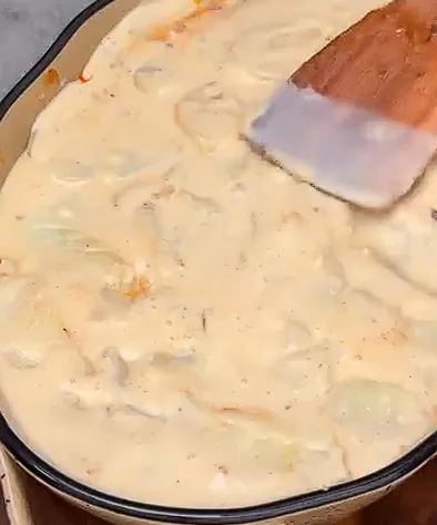 Step 5: Keep stirring the cream sauce over low heat until everything melts together and starts to bubble gently.